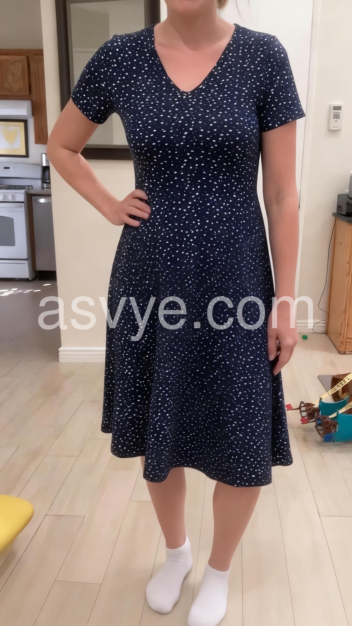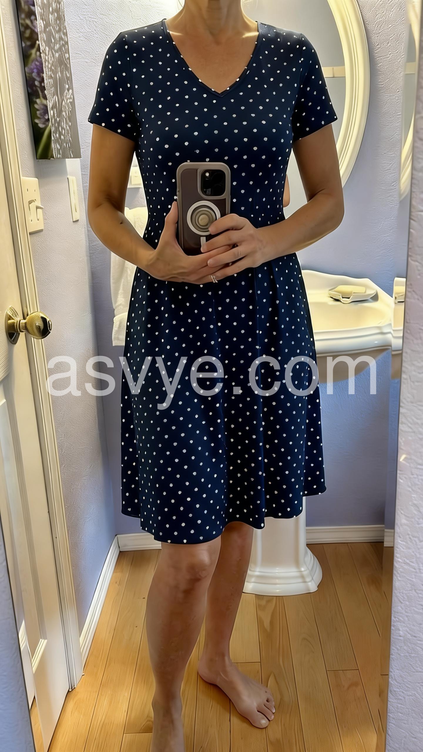 Absolutely love this dress! The navy blue with little white dots is so cute. It fits perfectly around the waist and is very flattering.