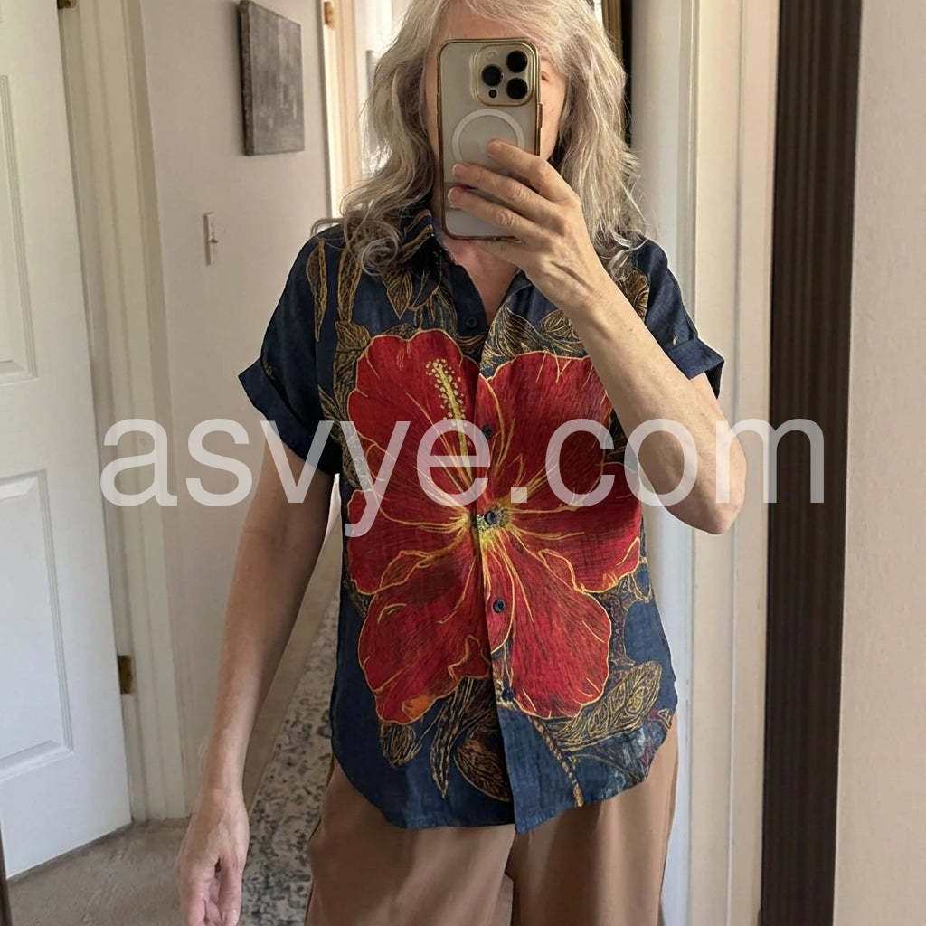 The detail on the gold leaves and the big red flower is gorgeous. It does not look cheap at all. Definitely one of my favorite summer shirts now.
