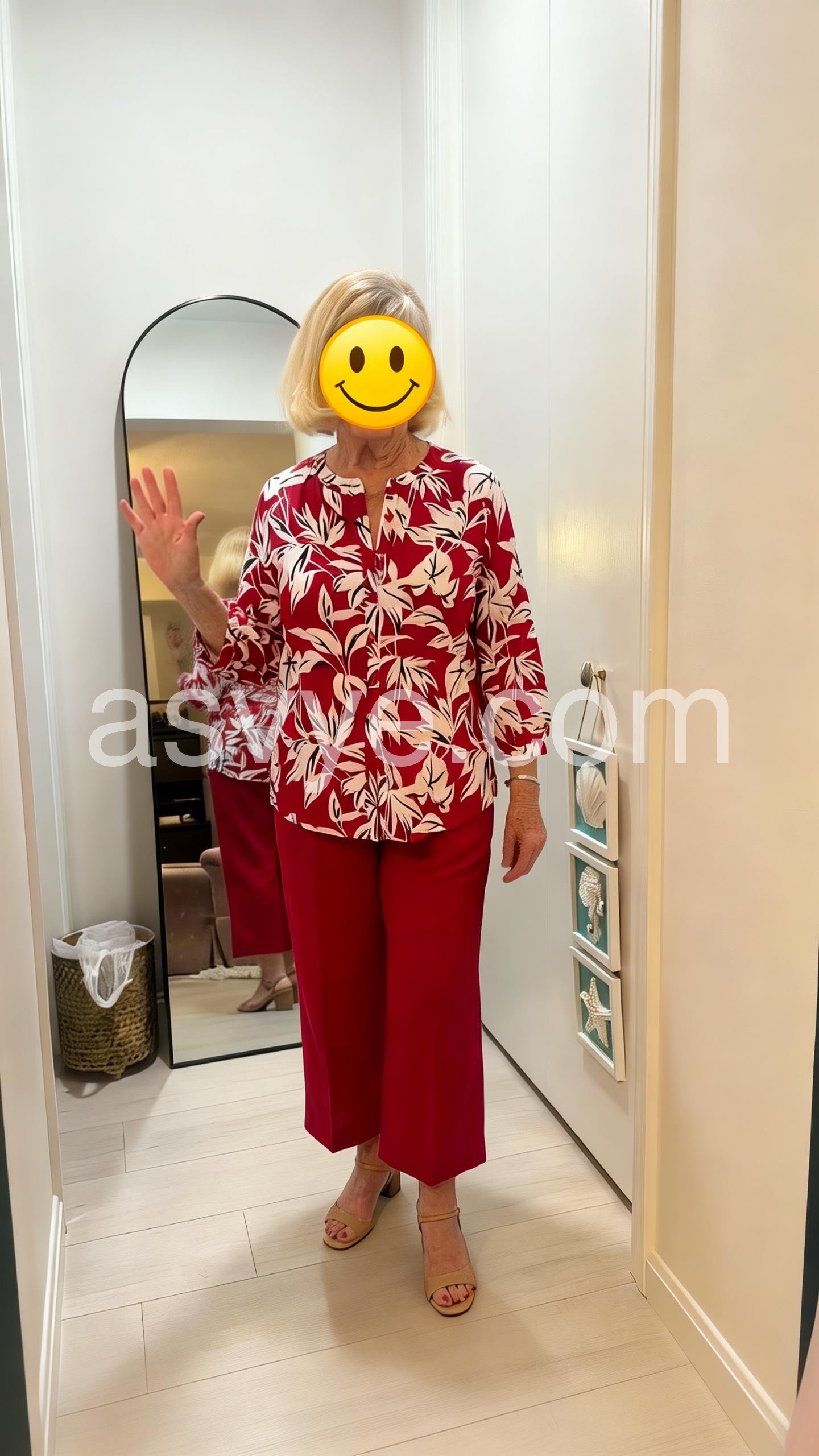 I bought this two-piece set for an upcoming cruise and it is absolutely perfect. The vibrant red color and the white leaf print look so tropical and chic. The fabric is lightweight and breathable, making it ideal for warm weather. Plus, the cropped pants have a very comfortable fit. I received so many compliments when I wore it!
