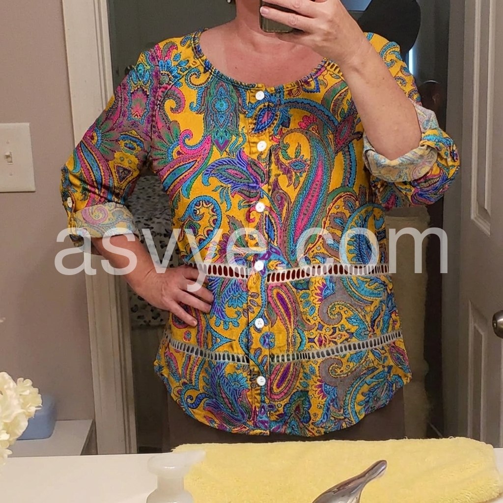 Love the relaxed fit of this blouse. It drapes nicely and does not cling to the body. The ladder lace details across the waist break up the pattern nicely. Very happy with this purchase.