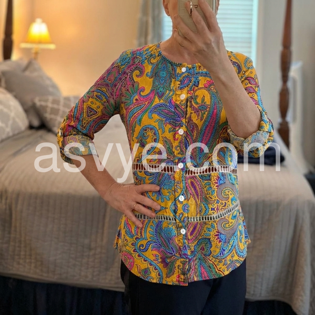 I absolutely love this top! The paisley pattern is so vibrant and beautiful in person. The mustard yellow color really pops. It fits true to size and the length is perfect to wear with leggings or jeans.