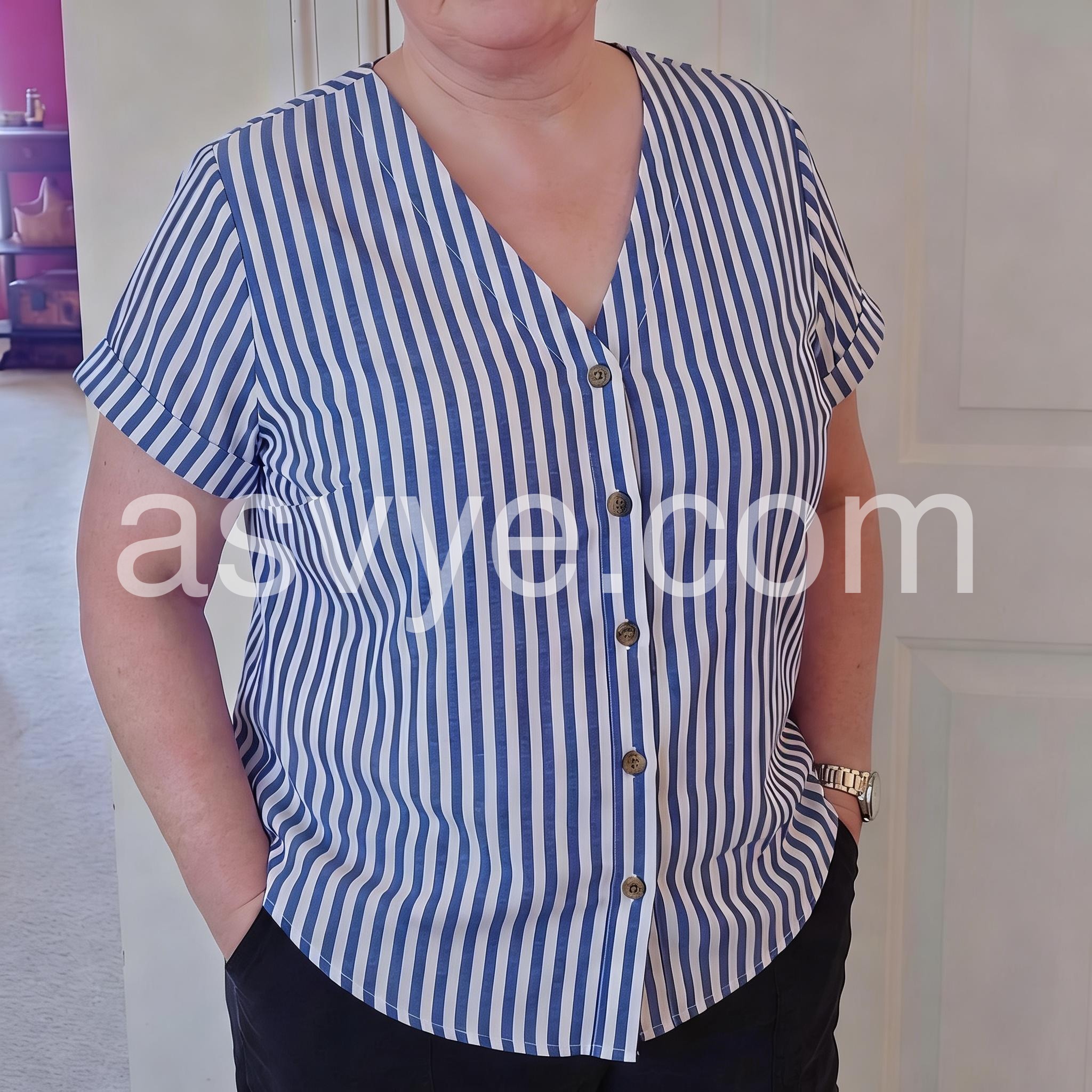 I am very happy with this blouse. It's very rare for me that clothing purchased online fits well and is of good quality. And this is one of those cases. High-quality fabric. A wonderful stripe blue color. And a loose silhouette with correct sizing. I am very pleased with my purchase.