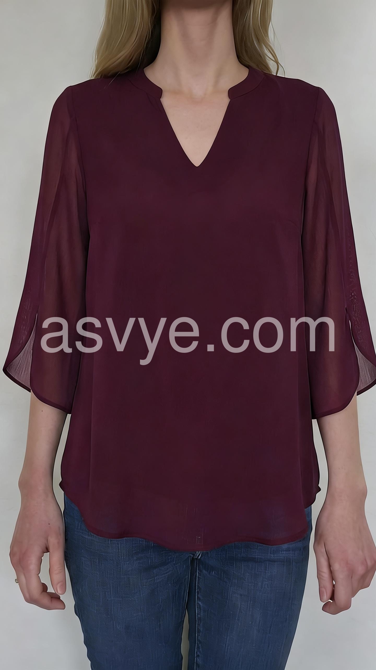 I absolutely love this blouse! The plum color is rich and beautiful. The double-layer design is perfect because it gives that elegant sheer look without being see-through. Fits true to size and hides my tummy perfectly. Highly recommend!