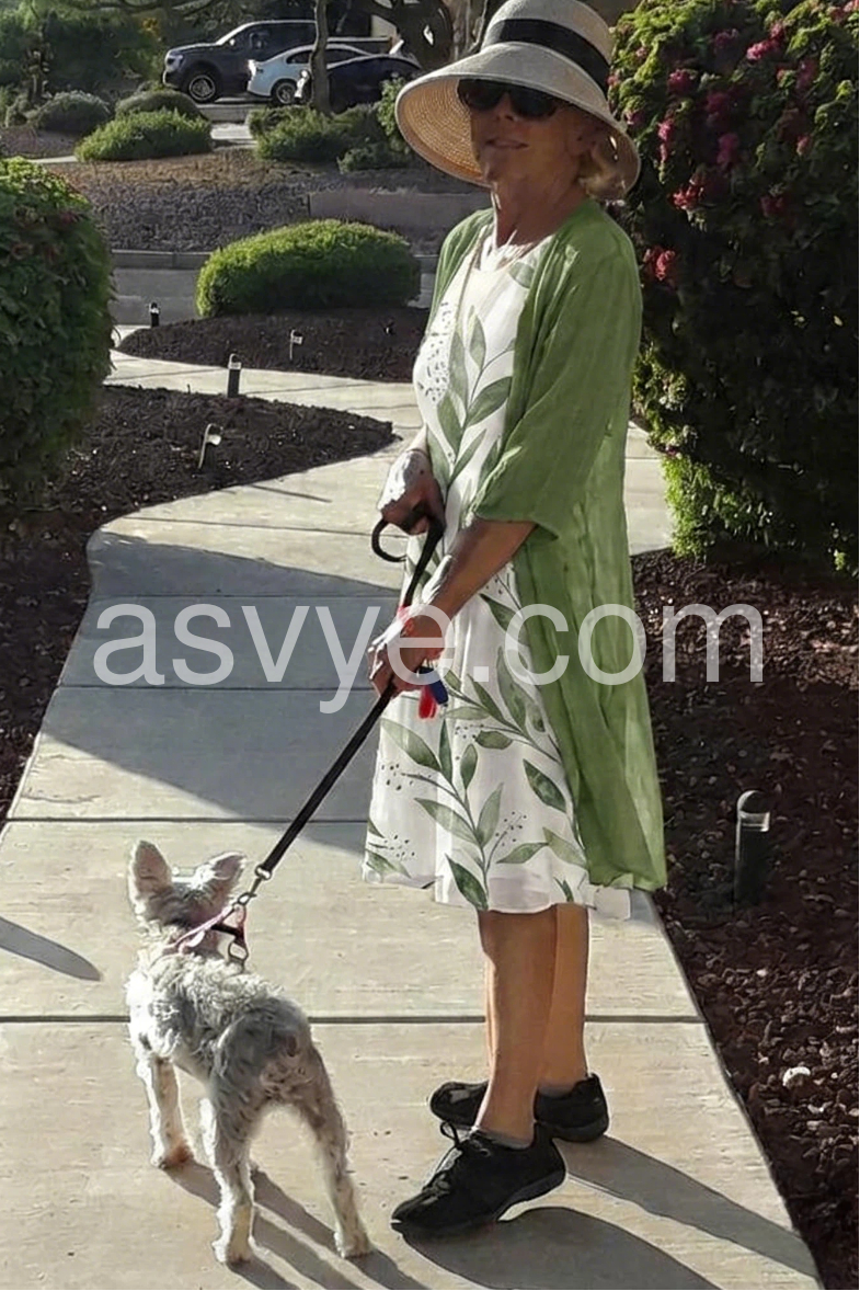 Absolutely love this two piece set! The dress flows beautifully and does not cling to my midsection. The green color is exactly as pictured. It is extremely comfortable for all day wear. Highly recommend.