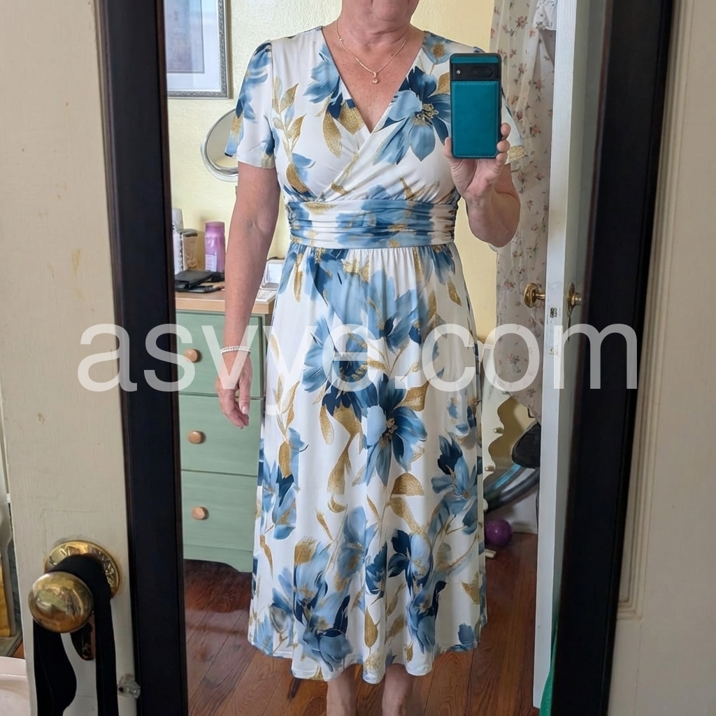 true to size (medium for me- 5’4” 150lbs) and comfortable. I am very pleased with this A line pleated flare dress. The cut is flattering and the overall construction feels well done. I ordered a size medium as I am normally an 8/10 and the medium worked well. One thing I especially appreciate is that it is modest while still looking polished. It feels like a complete outfit all on its own, which makes getting dressed simple. I am very happy with it and would recommend it.