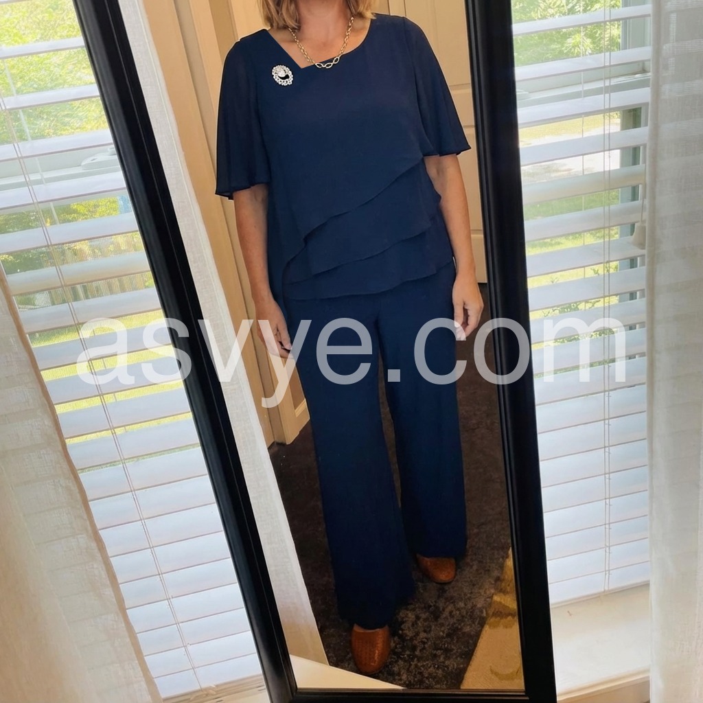 This outfit is a lifesaver. I am not a dress person, so finding something formal enough for an evening gala was stressing me out. This pant suit looks just as dressy as a gown. The navy color is deep and rich. It fits true to size and the chiffon overlay is gorgeous.