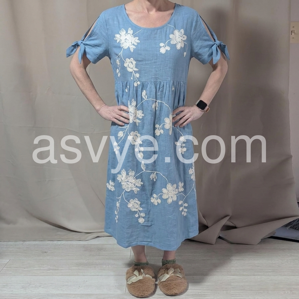 The sleeve ties are such a cute detail! This dress is so flowy and flattering. I carry a bit of extra weight in my midsection, and the loose fit just skims right over it. The fabric feels like a nice linen blend. Perfect for a summer day.