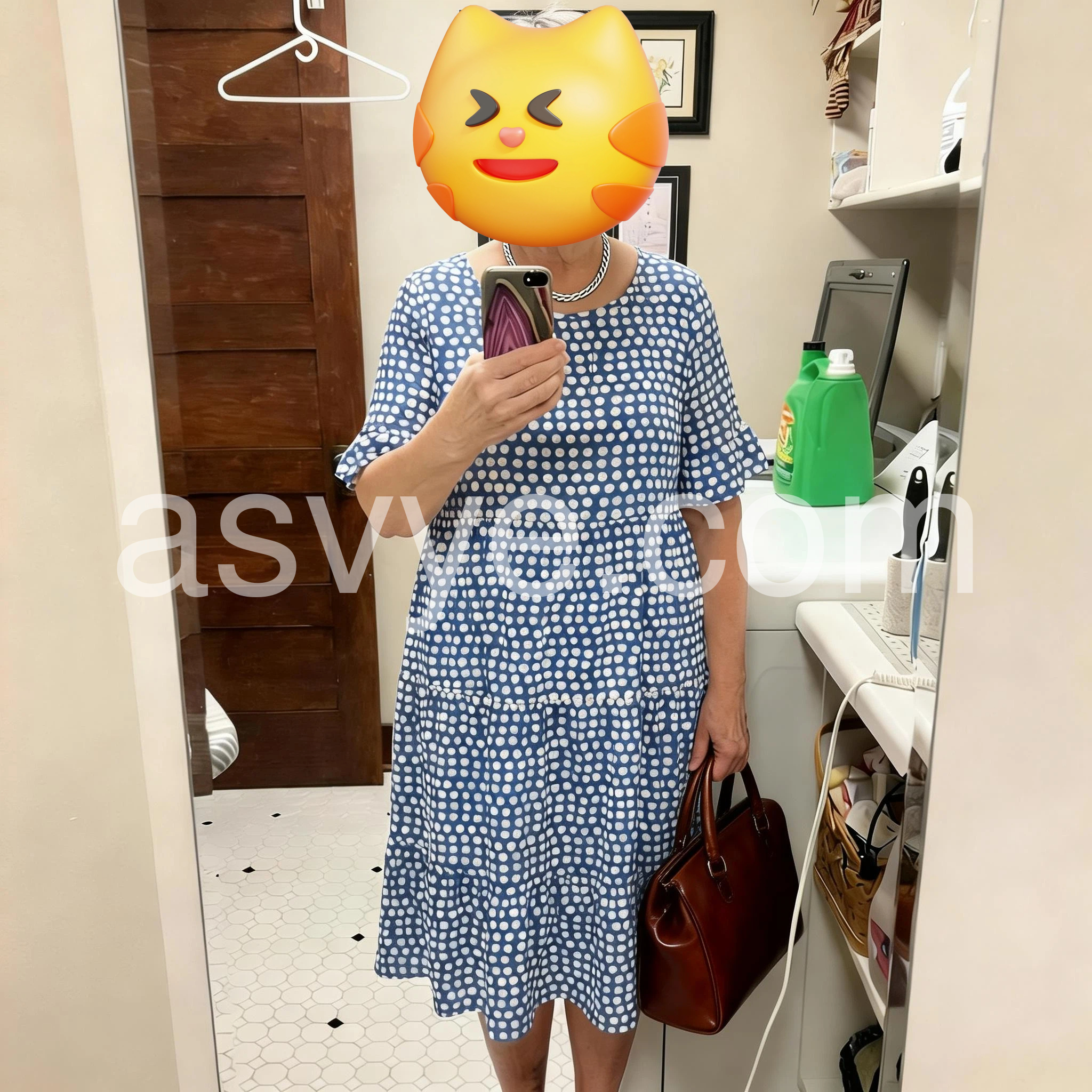I love how effortless this dress looks while still feeling stylish. The fabric is light and breathable, and the relaxed cut is flattering in all the right ways—it skims my body instead of clinging. The blue-and-white dotted print is so classic. With a straw bag and simple sandals, it’s the perfect outfit for a getaway or a sunny day out.