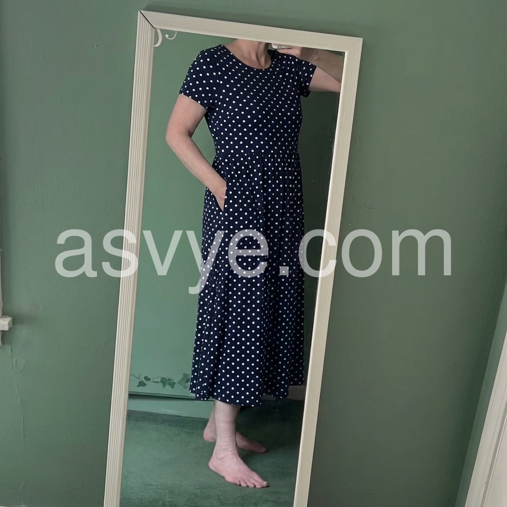 Absolutely love this dress. The A-line cut is incredibly flattering on my curves and hides my tummy perfectly. The short sleeves give just the right amount of coverage.