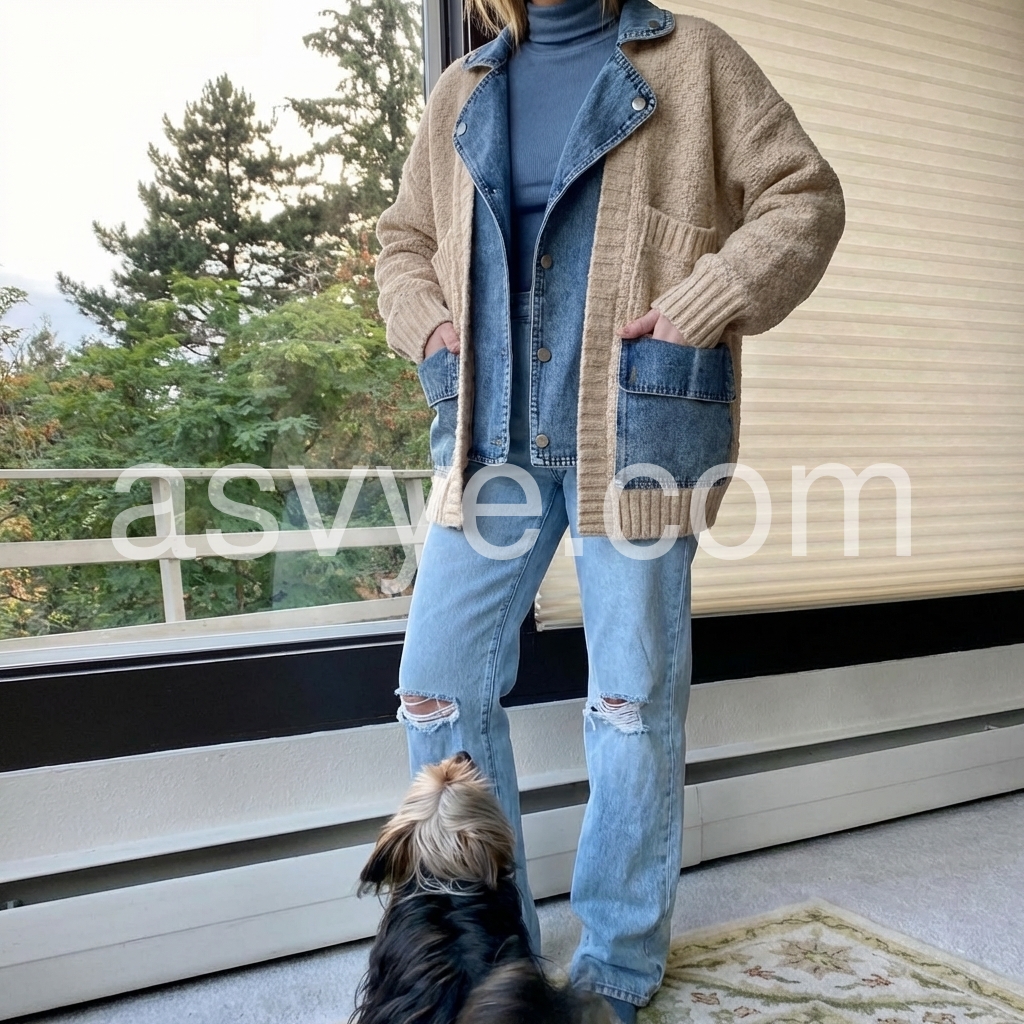 This jacket is a fun addition to my wardrobe! The look is unique with the combination of sweater and demin. The jacket is quite warm and perfect for throwing over a T-shirt and walking the dog on cool days. It is casual, but would also be fine for running to the store or grabbing coffee with a friend. Could be dressed up a little bit with a blouse underneath and a boho necklace. Whenever I put this on, I feel warm and cozy. That's the best part!
