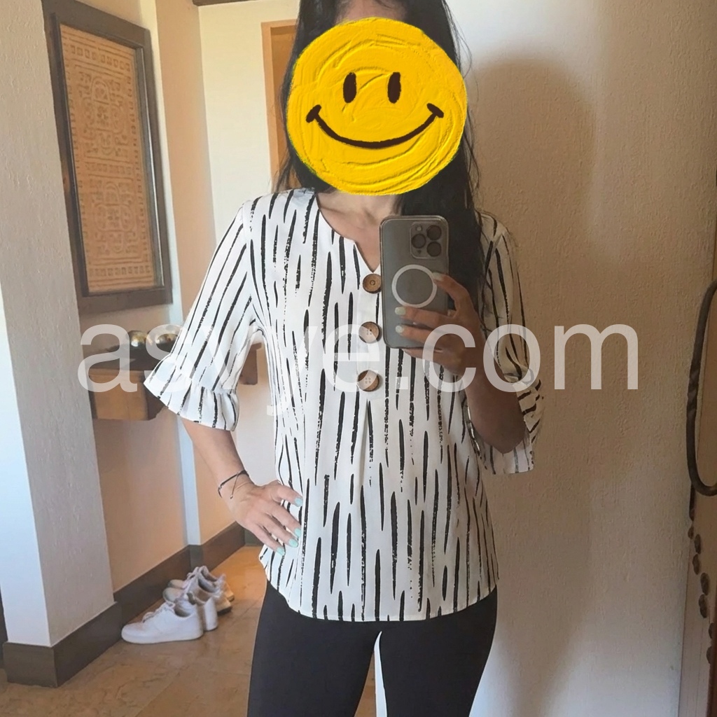 I am absolutely in love with the ruffle sleeves and those cute wooden buttons down the front! It adds such a nice boho touch. The v-neck is flattering and not too deep. Highly recommend for a casual day out.
