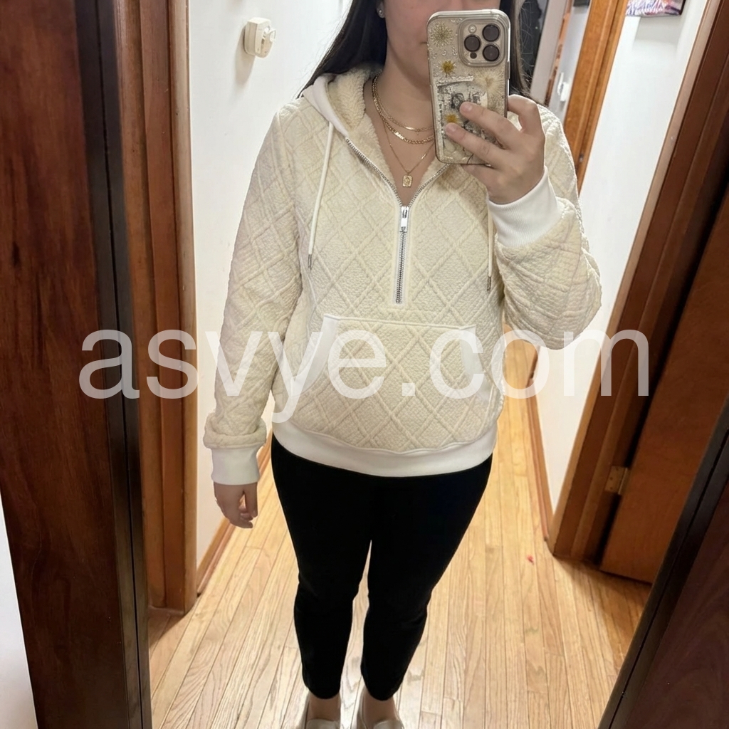 The quality of this hoodie sweater surprised me. The stitching and quilted diamond design are neat and well-made, and the fit feels flattering without being too tight. I also appreciate the zipper and kangaroo pocket; they make it practical for everyday wear while still looking fashionable.