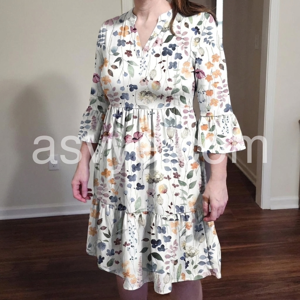 I like this dress more than I expected. I'm not a fan of this bell style sleeve but it looks good. The top is fitted with a flare skirt and it fits well and is true to size. The material is good quality and has enough give to be comfortable.