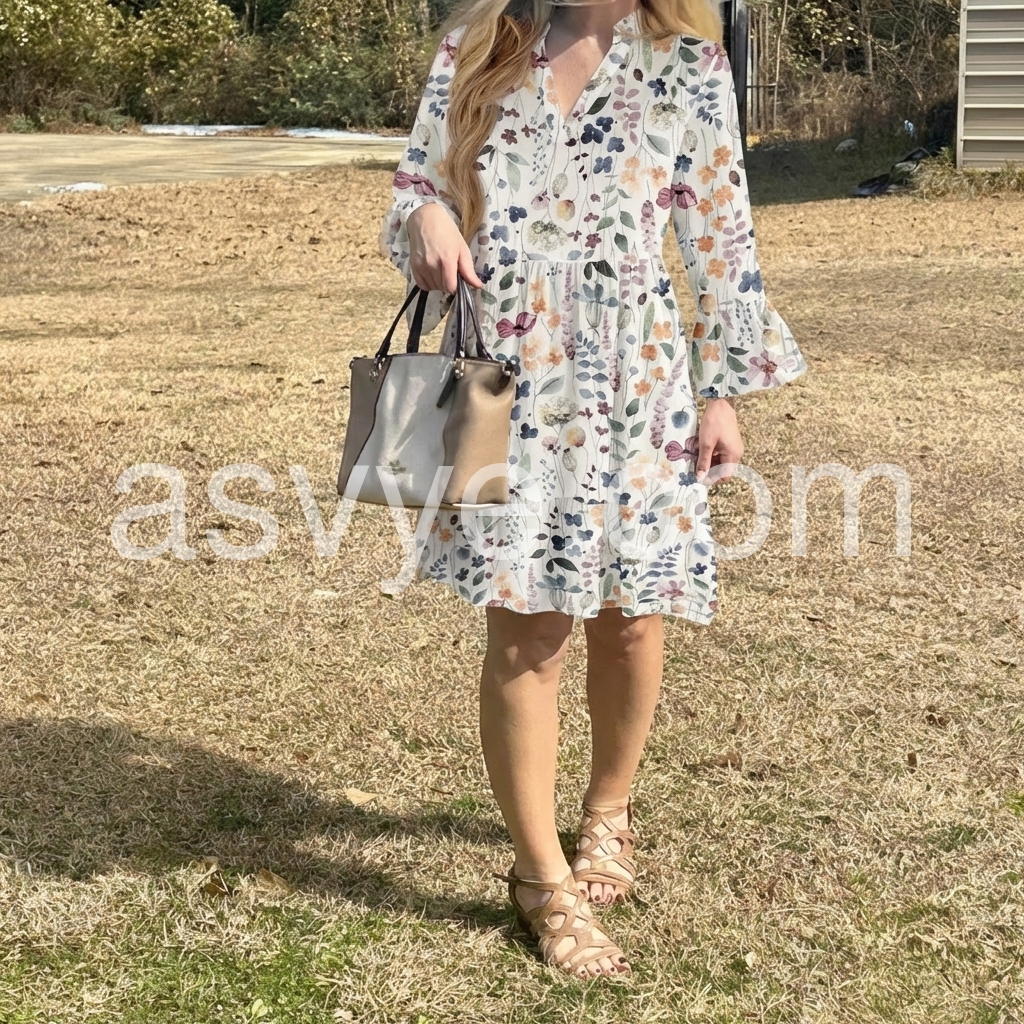 This dress is everything I hoped for. The pastel flowers on the white background are so fresh for spring. It fits nicely through the shoulders and then flows out, making it very forgiving.