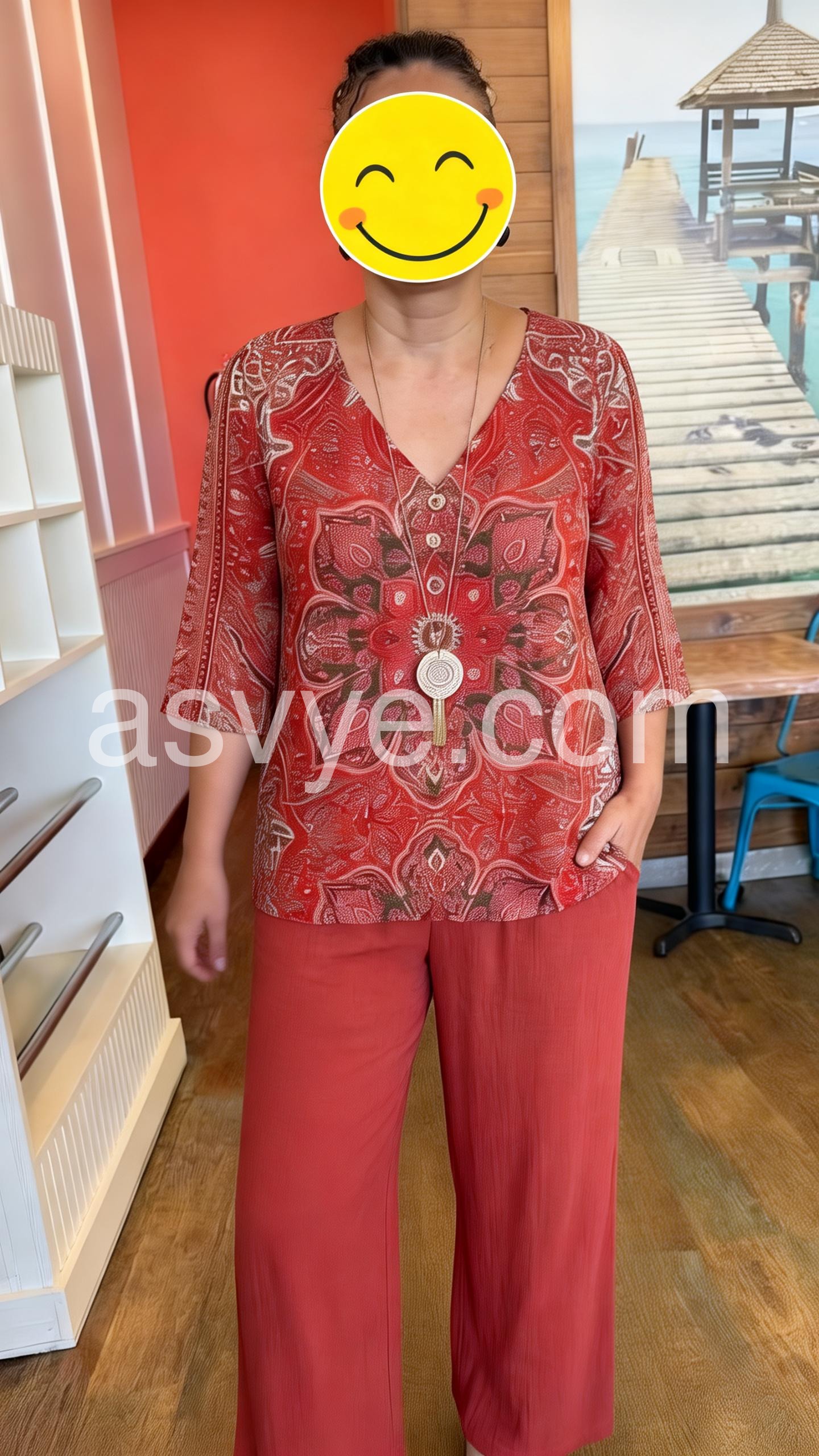 Such a versatile set! The boho print top looks amazing with the matching pants, but I also wear it with my favorite jeans. The pants are lovely with a simple white tank top. Great value for getting two quality pieces.