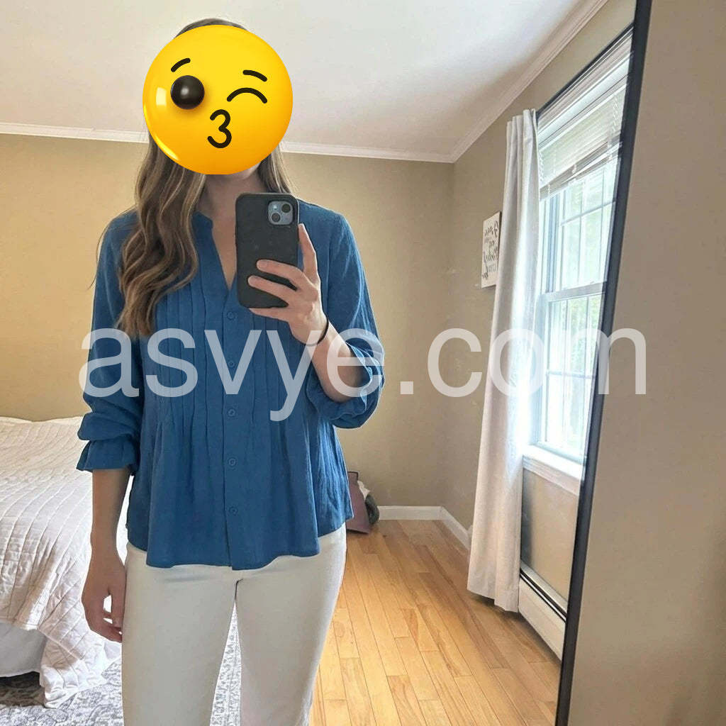 This blouse is so versatile! I can pair it with white jeans for a dressier look or just regular denim for running errands. The button-down v-neck design is modest but stylish. Highly recommend!