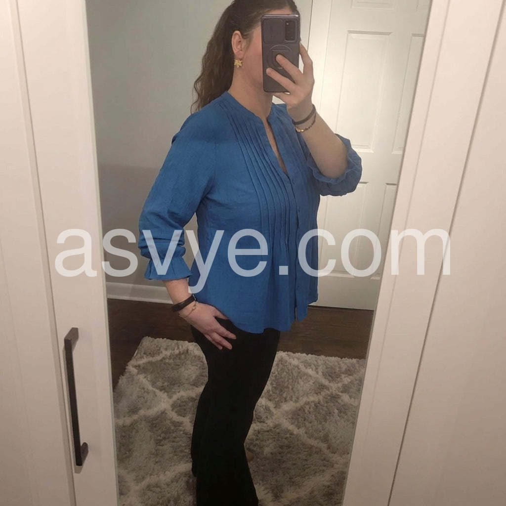 I absolutely love the color of this top! The blue is exactly as pictured and the fit is incredibly flattering. The pleats down the front give it a nice structure while still being flowy and comfortable. Fits true to size.