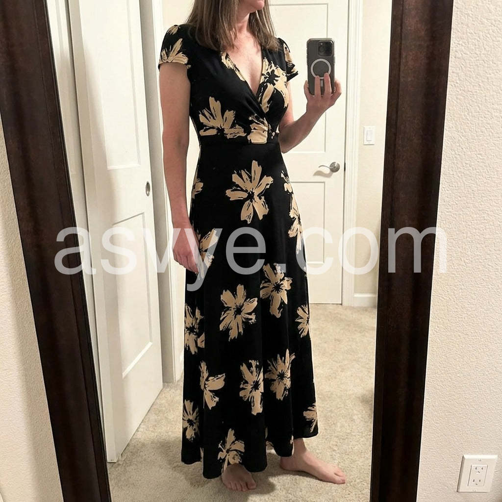 I absolutely love this dress! The black and beige floral pattern is incredibly striking and elegant. I wore it to a beach wedding and received so many compliments. The v-neck is flattering without being too revealing, and the material is soft and flowing. Highly recommend!