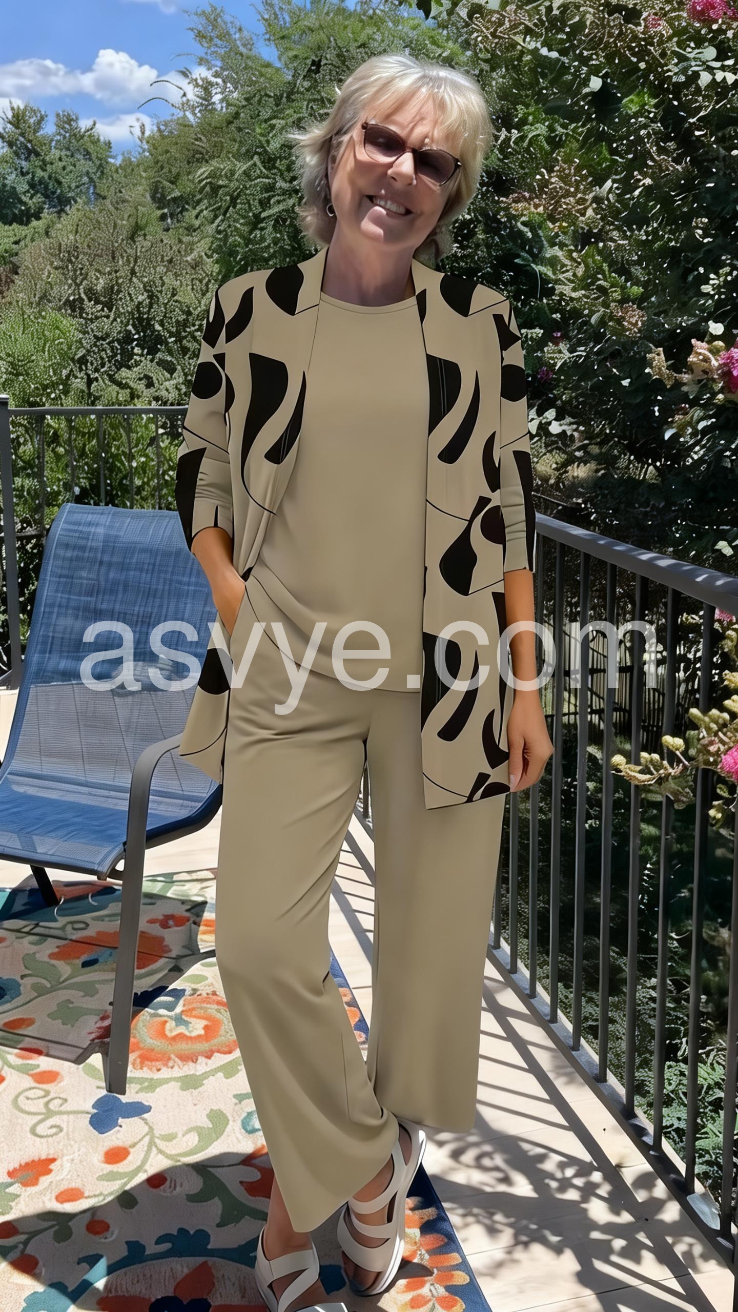 Absolutely love this two piece set! The material is incredibly soft and drapes beautifully. I wore it to a work conference and felt so put together but comfortable all day. The abstract pattern on the jacket adds the perfect amount of flair. Highly recommend!