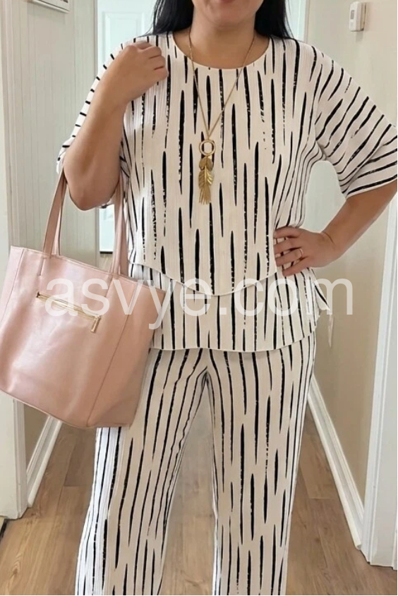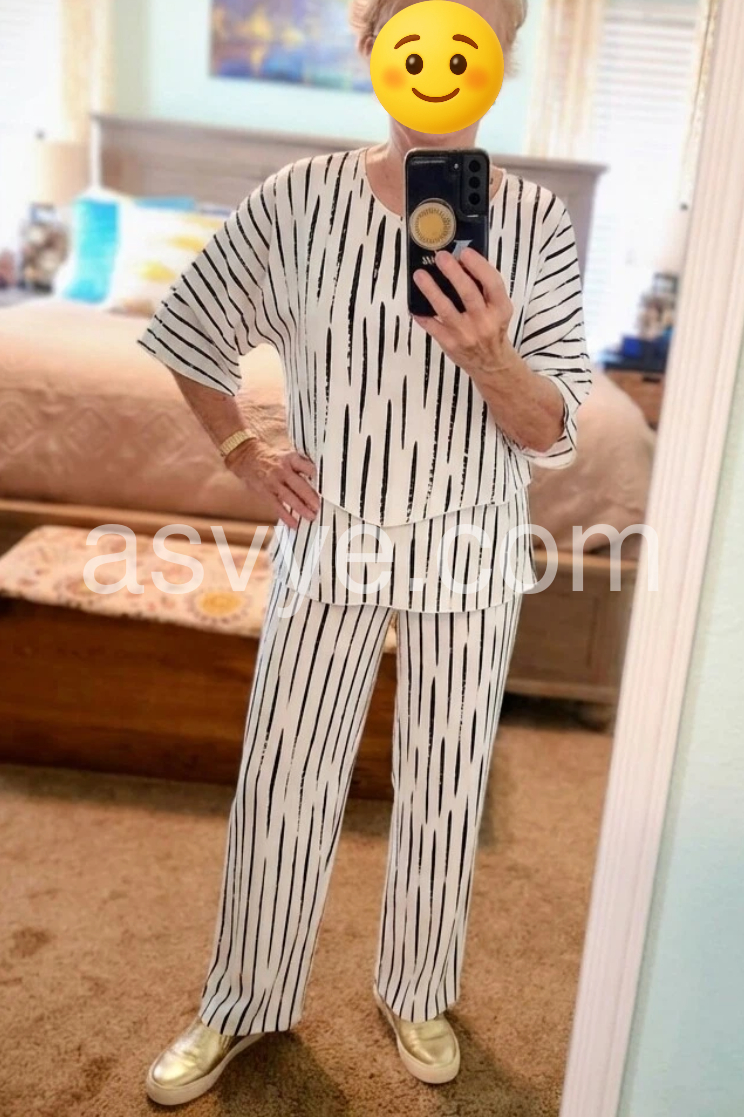 Absolutely love this outfit! You can wear the top and pants together for a striking look, or mix and match them with other items in your closet. The abstract stripes are very slimming. The fabric doesn't wrinkle easily, making it great for travel.