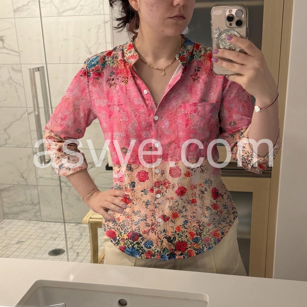 Beautiful blouse. The gradient effect makes it unique compared to standard floral shirts. It is my new go-to top for spring.